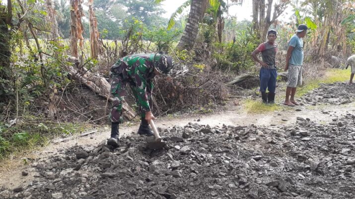 Babinsa Koramil 1406-10/Pitumpanua, Sertu Nanang Subroto, melaksanakan kegiatan kerja bakti pengerasan jalan tani bersama masyarakat di Dusun Jawi Jawi, Desa Bau-Bau, Kecamatan Pitumpanua, Kabupaten