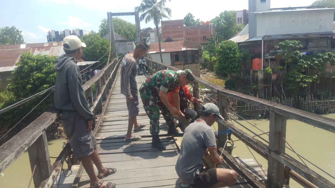 Perbaikan jembatan tersebut dilakukan karena kondisinya mulai rusak dan membahayakan pengguna, terutama masyarakat yang setiap hari melintas untuk bekerja maupun beraktivitas di Kota Sengkang. Melalui kerja sama dan semangat kebersamaan, Babinsa bersama masyarakat bahu-membahu memperbaiki bagian jembatan yang rusak agar dapat kembali digunakan dengan aman.