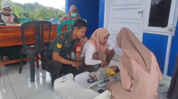 Wajo — Babinsa Koramil 1406-01/Tempe, Serka Muslimin, melaksanakan pendampingan kegiatan Posyandu bersama Bidan dan kader Posyandu Kelurahan, serta petugas kesehatan dari UPT Puskesmas Pattirosompe di Kelurahan Pattirosompe, Kecamatan Tempe, Kabupaten Wajo, Selasa (14/10/2025)