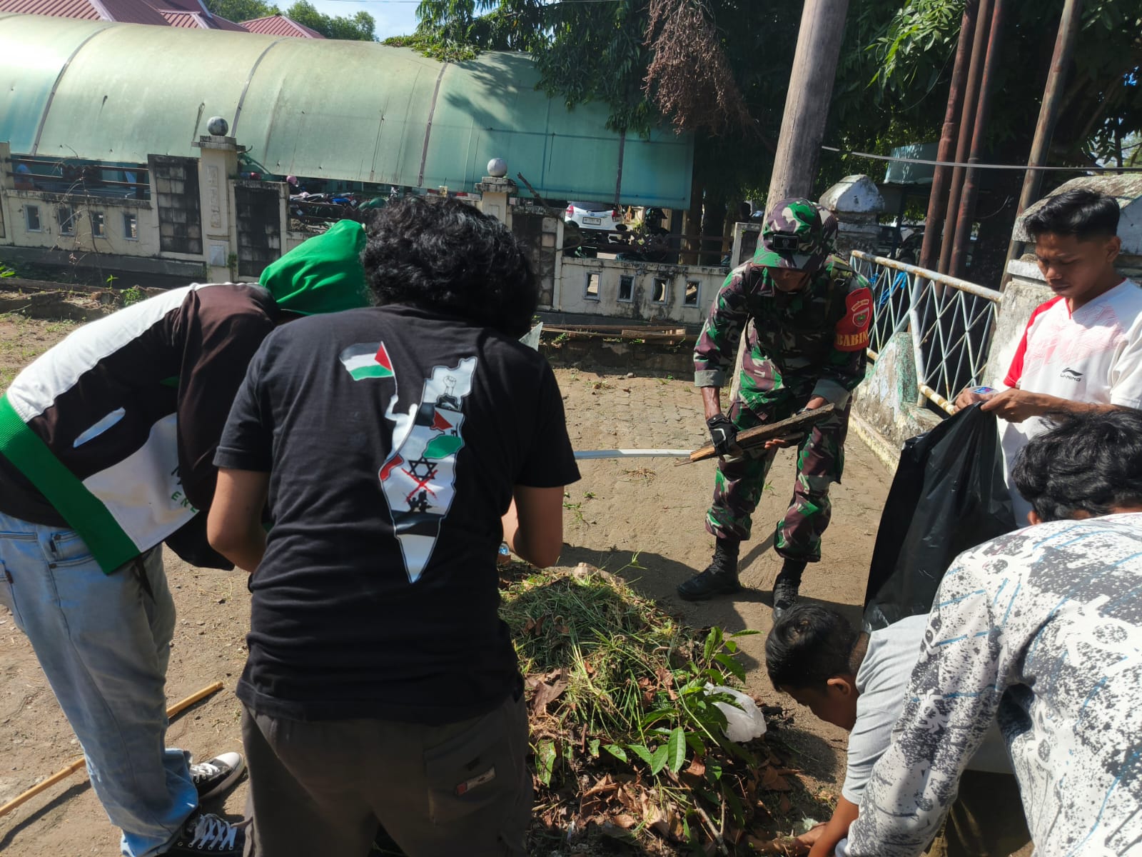 Babinsa Koramil 1406-01/Tempe, Serda Yadi, melaksanakan kegiatan kerja bakti bersama warga di Kelurahan Laelo, Kecamatan Tempe, Kabupaten Wajo, Jumat (12/12/2025). Kegiatan ini difokuskan pada pengangkatan dan pembersihan sampah di lingkungan setempat.
