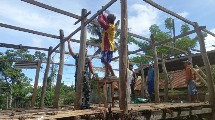 Babinsa Koramil 1406-02/Tanasitolo Bantu Warga Bongkar Rumah Panggung di Desa Lowa