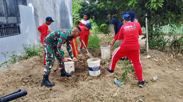 Babinsa Koramil 1406-02/Tanasitolo dan Siswa SMPN 4 Tanasitolo Gelar Kerja Bakti di Desa Assorajang