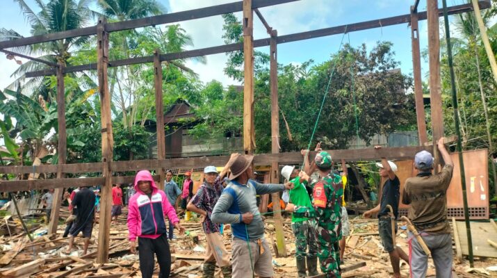 Wajo — Babinsa Koramil 1406-03/Maniangpajo, Serka Juhar melaksanakan kegiatan gotong royong membantu warga membongkar rumah panggung yang sudah lapuk karena dimakan usia di Desa Abbattireng, Kecamatan Gilireng, Kabupaten Wajo, Kamis (16/10/2025)