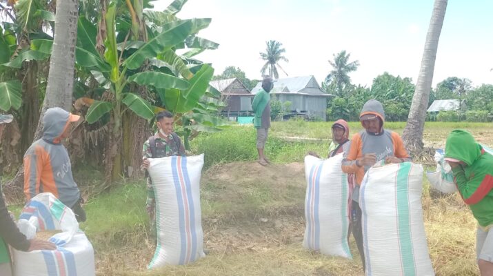Wajo — Babinsa Koramil 1406-04/Belawa, Sertu Yakub melaksanakan pendampingan panen padi bersama para petani di Desa Wele, Kecamatan Belawa, Kabupaten Wajo, Rabu (15/10/2025)