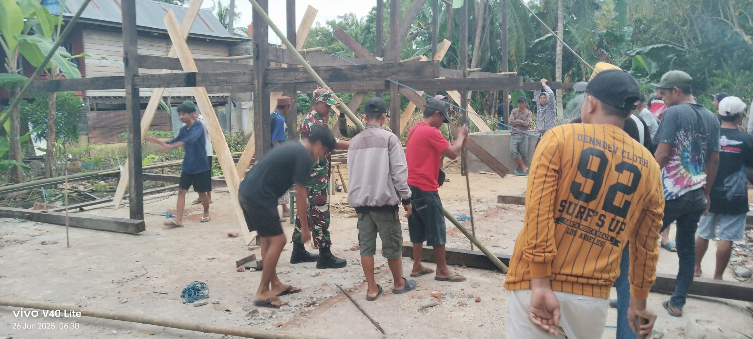 Wajo — Babinsa Koramil 1406-06/Pammana, Sertu Ridwan, bersama masyarakat Desa Tobatang, Kecamatan Pammana, Kabupaten Wajo, bergotong royong mendirikan rumah panggung milik salah satu warga, Bapak Sukardin, pada Kamis (3/7/2025). Kegiatan gotong royong ini merupakan wujud kepedulian dan kebersamaan Babinsa dalam membantu mengatasi kesulitan warga di wilayah binaannya.