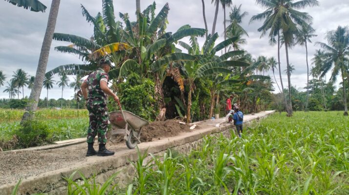 Babinsa Koramil 1406-08/Sabbangparu, Koptu Bakri, membantu masyarakat melaksanakan kegiatan pengecoran jalan tani sebagai akses untuk mengangkut hasil panen, bertempat di Dusun Caleko Orai Salo, Desa Wage, Kecamatan Sabbangparu, Kabupaten Wajo, Minggu (14/11/2025).