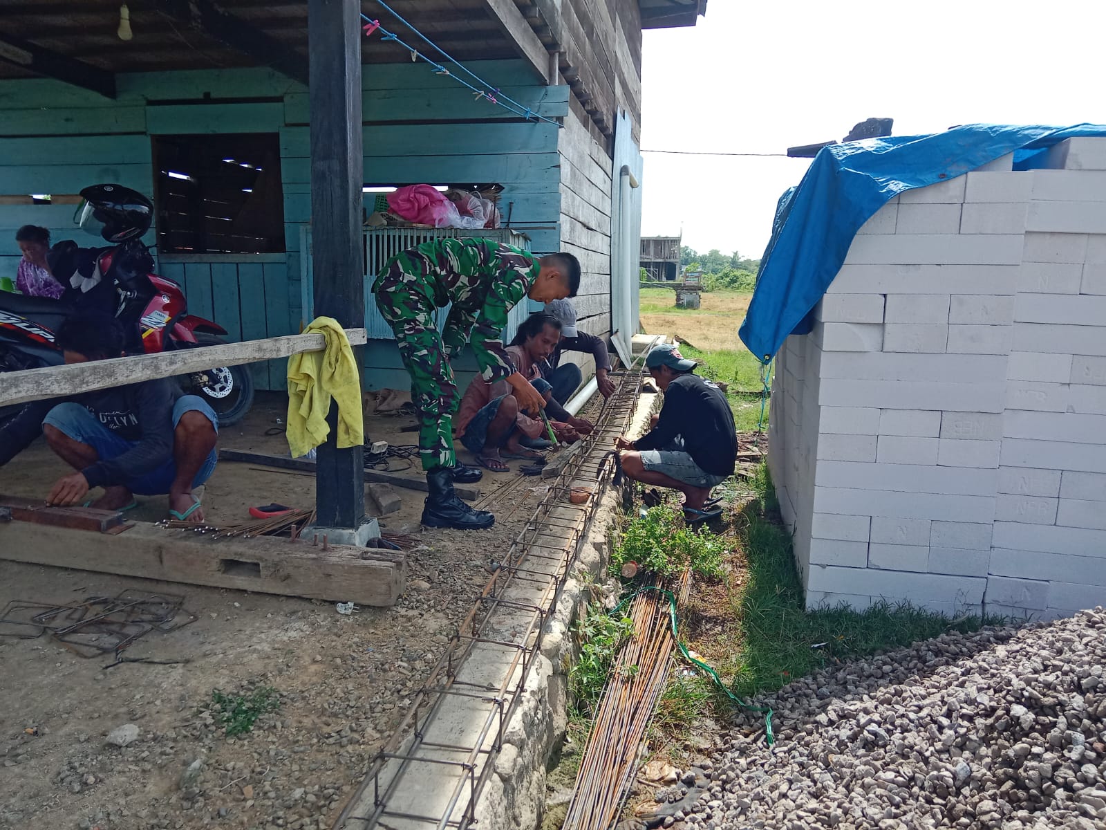 Dalam kegiatan tersebut, Kopda Jusman tidak hanya memonitor situasi dan kondisi wilayah, tetapi juga turun langsung membantu proses pembangunan pondasi rumah warga. Hal ini dilakukan untuk mempererat hubungan kemasyarakatan serta menunjukkan komitmen Babinsa dalam memberikan dukungan nyata kepada masyarakat.