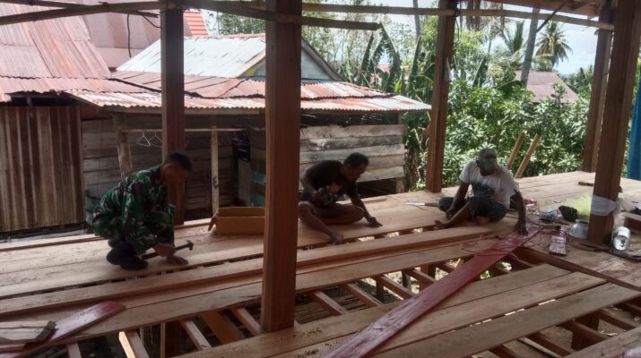 WAJO – Wujud kepedulian terhadap warga binaan ditunjukkan oleh Babinsa Koramil 1406-08/Sabbangparu Serka Asriadi dengan membantu masyarakat dalam pemasangan papan lantai rumah baru di Kelurahan Talotenreng, Kecamatan Sabbangparu, Kabupaten Wajo, Jumat (07/11/2025).