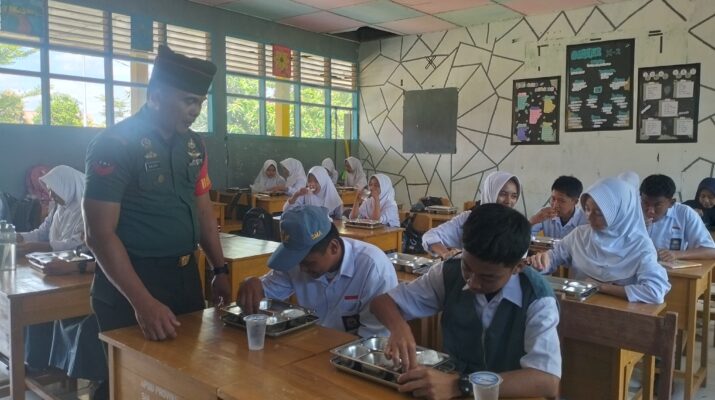 Wajo – Babinsa Koramil 1406-08/Sabbangparu, Koptu Bakri, melaksanakan pendampingan kegiatan Makan Bergizi Gratis (MBG) di SMAN 10 Sabbangparu yang berlokasi di Dusun Caleko Alau Salo, Desa Wage, Kecamatan Sabbangparu, Kabupaten Wajo, Selasa (07/10/2025).