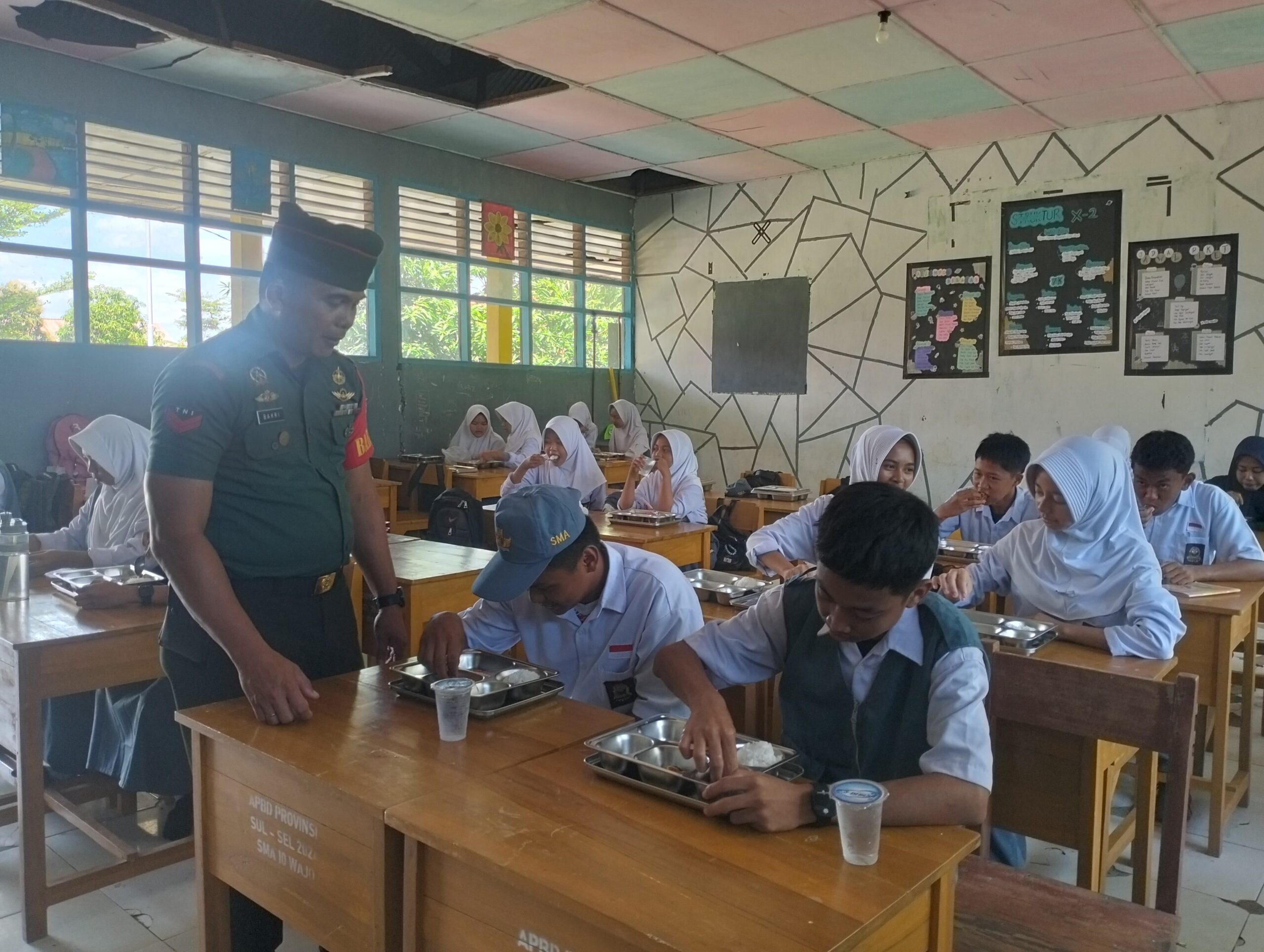 Wajo – Babinsa Koramil 1406-08/Sabbangparu, Koptu Bakri, melaksanakan pendampingan kegiatan Makan Bergizi Gratis (MBG) di SMAN 10 Sabbangparu yang berlokasi di Dusun Caleko Alau Salo, Desa Wage, Kecamatan Sabbangparu, Kabupaten Wajo, Selasa (07/10/2025).