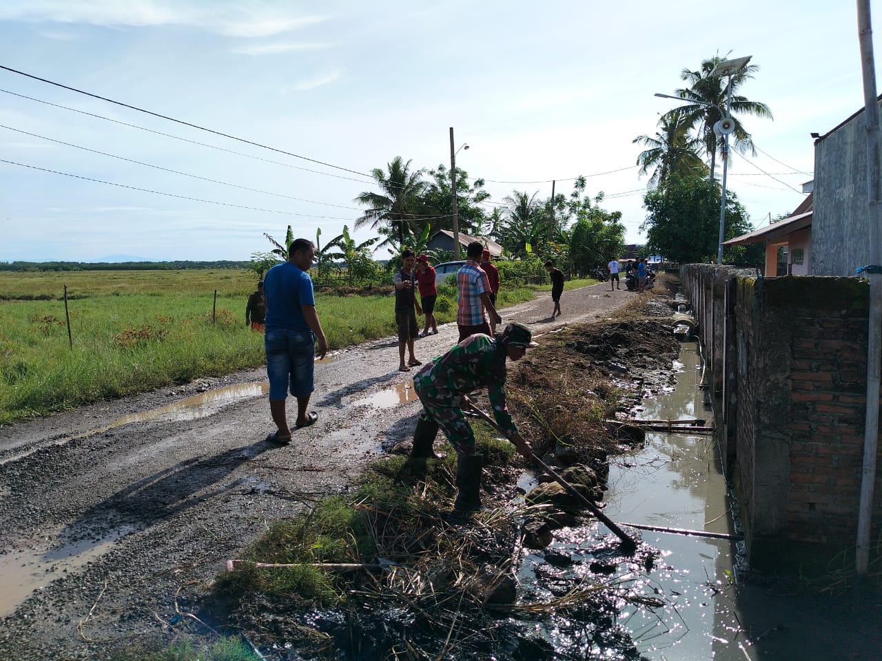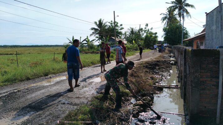 Wajo — Babinsa Koramil 1406-09/Sajoanging Sertu Irianto K bersama masyarakat melaksanakan kegiatan gotong royong membersihkan selokan/parit di Dusun Lawara, Desa Raddae, Kecamatan Penrang, Kabupaten Wajo, Rabu (3/12/2025).
