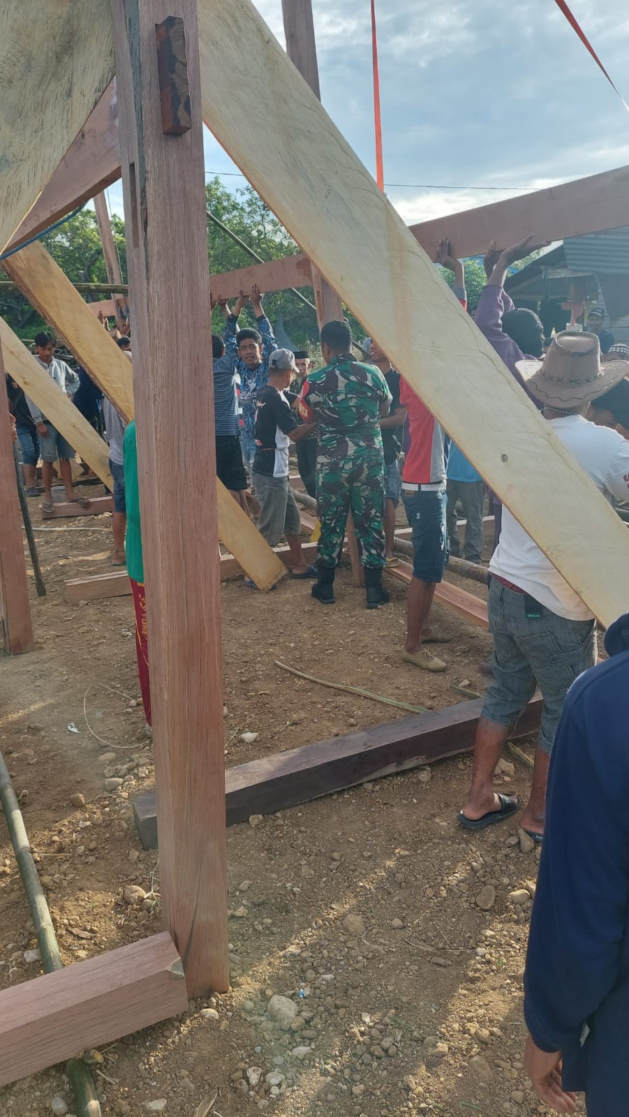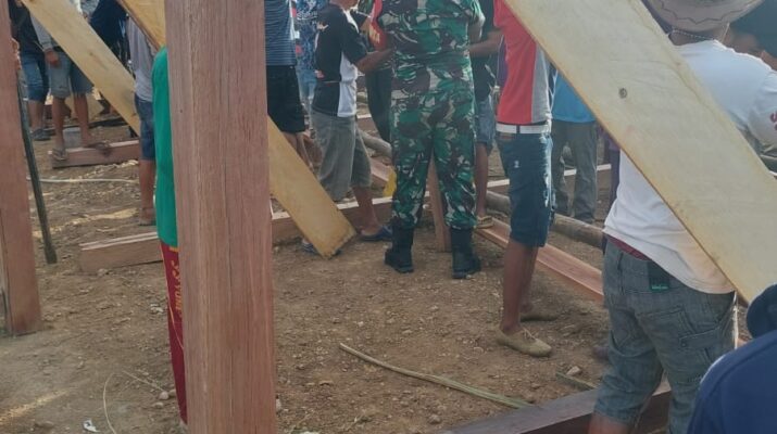 Wajo – Babinsa Koramil 1406-09/Sajoanging, Serda Thamrin, melaksanakan kegiatan gotong royong membantu mendirikan rumah baru salah satu warga di Desa Sakkoli, Kecamatan Sajoanging, Kabupaten Wajo, Jumat (5/12/2025).