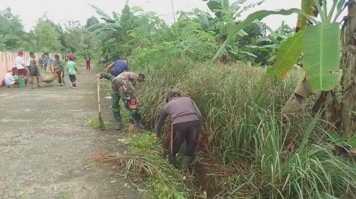 Wajo – Babinsa Koramil 1406-10/Pitumpanua, Serda Muhammad Ridwan, bersama masyarakat melaksanakan kerja bakti pembersihan saluran air di SDN 418 Desa Alelebbae, Kecamatan Pitumpanua, Kabupaten Wajo, Selasa (30/09/2025).