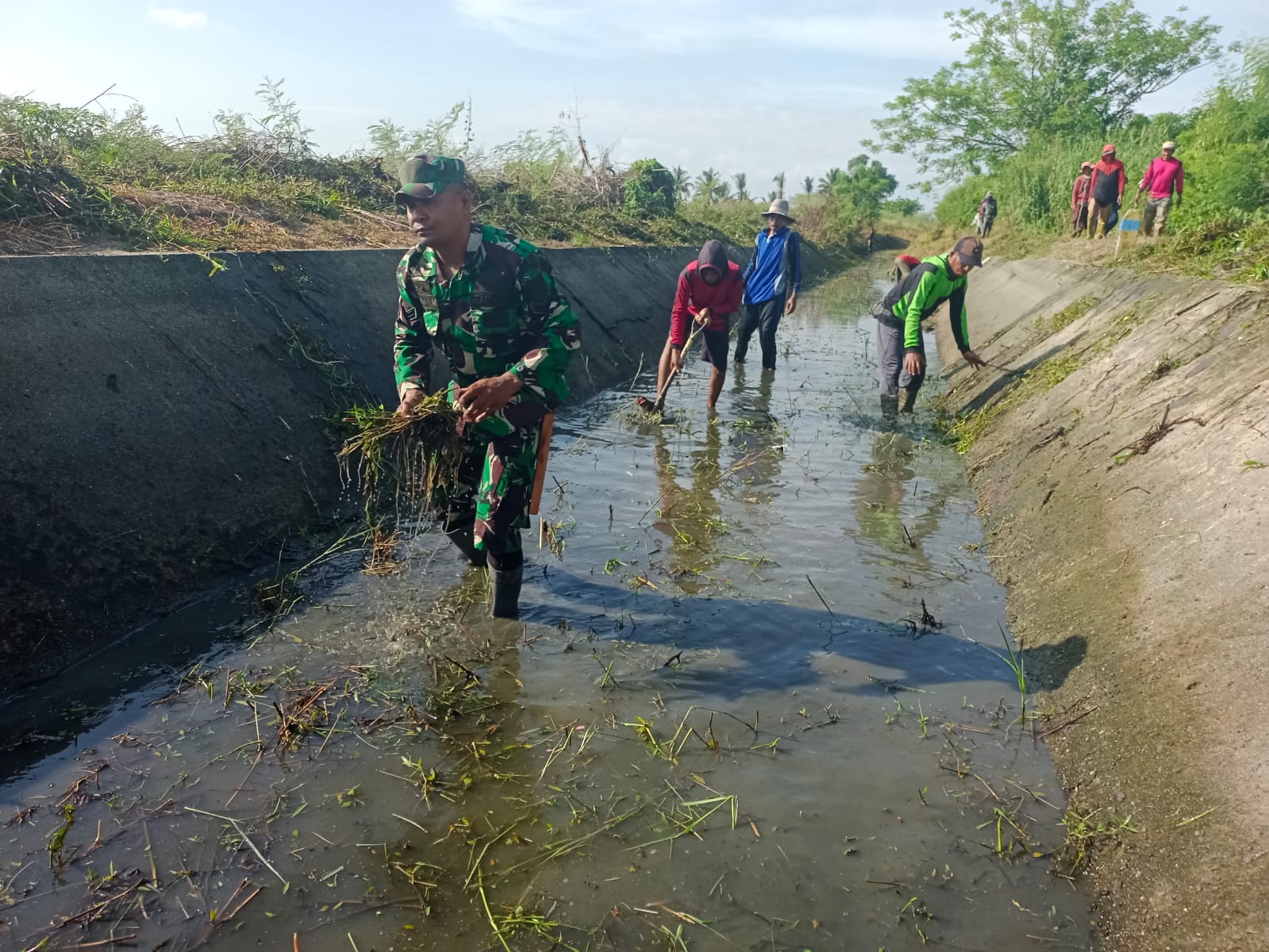 Dalam aksi gotong royong ini, para anggota Koramil 1406-04/Belawa bersama petani setempat bahu-membahu membersihkan sampah, lumpur, dan tanaman liar yang menghambat aliran air di saluran irigasi. Hal ini dilakukan sebagai langkah antisipasi terhadap kemungkinan banjir dan kekurangan air di musim kemarau mendatang.
