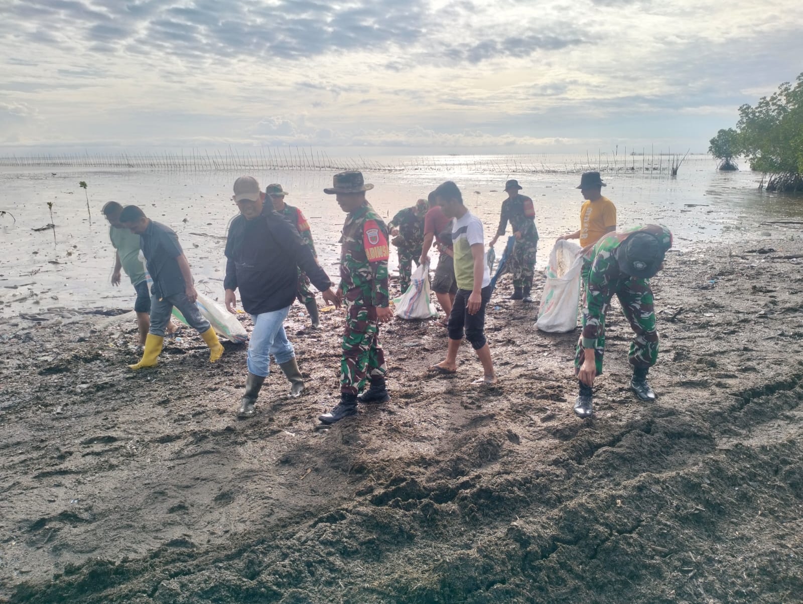 Koramil 1406-10/Pitumpanua Gelar Karya Bakti Bersihkan Pantai Siwa dari Sampah Laut