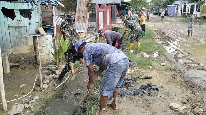 Wajo– Koramil 1406-10/Pitumpanua dipimpin oleh Sertu Sabir melaksanakan kegiatan Karya Bhakti pembersihan selokan dan saluran air bersama masyarakat di Kelurahan Benteng, Kecamatan Pitumpanua, Kabupaten Wajo, Jumat (5/11/2025).
