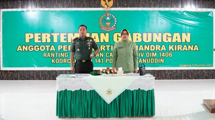 Wajo – Persit Kartika Chandra Kirana (KCK) Cabang XXIV Kodim 1406/Wajo Koordinator Cabang Korem 141 PD XIV/Hasanuddin menggelar pertemuan gabungan di Aula Serbaguna Makodim 1406/Wajo, Jalan Kejaksaan No. 55, Kelurahan Bulupabbulu, Kecamatan Tempe, Kabupaten Wajo, Selasa (9/12/2025). Kegiatan ini menjadi sarana mempererat silaturahmi serta memperkuat soliditas anggota Persit dalam mendukung tugas suami sebagai prajurit TNI AD.